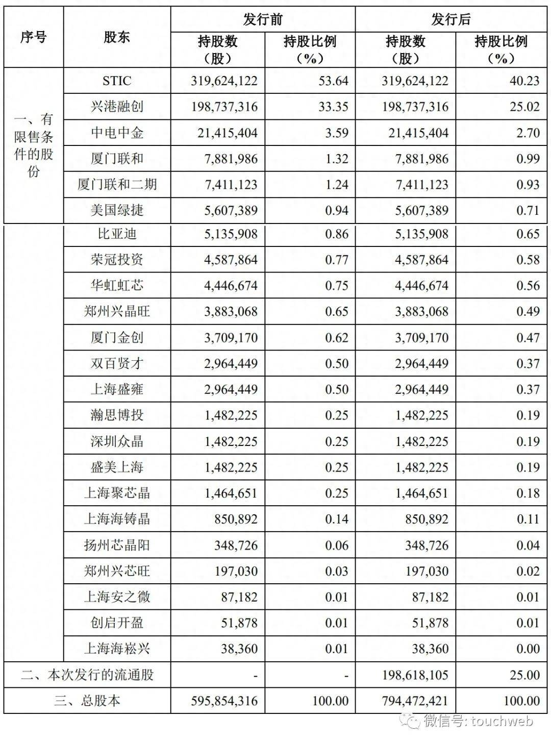 IPO后,STIC持股为40.23%,兴港融创持股为25.02%,中电中金持股为2.7%,厦门联和持股为0.99%,厦门联和二期持股为0.93%,美国绿捷持股为0.71%,比亚迪持股为0.65%,荣冠投资持股为0.58%;
