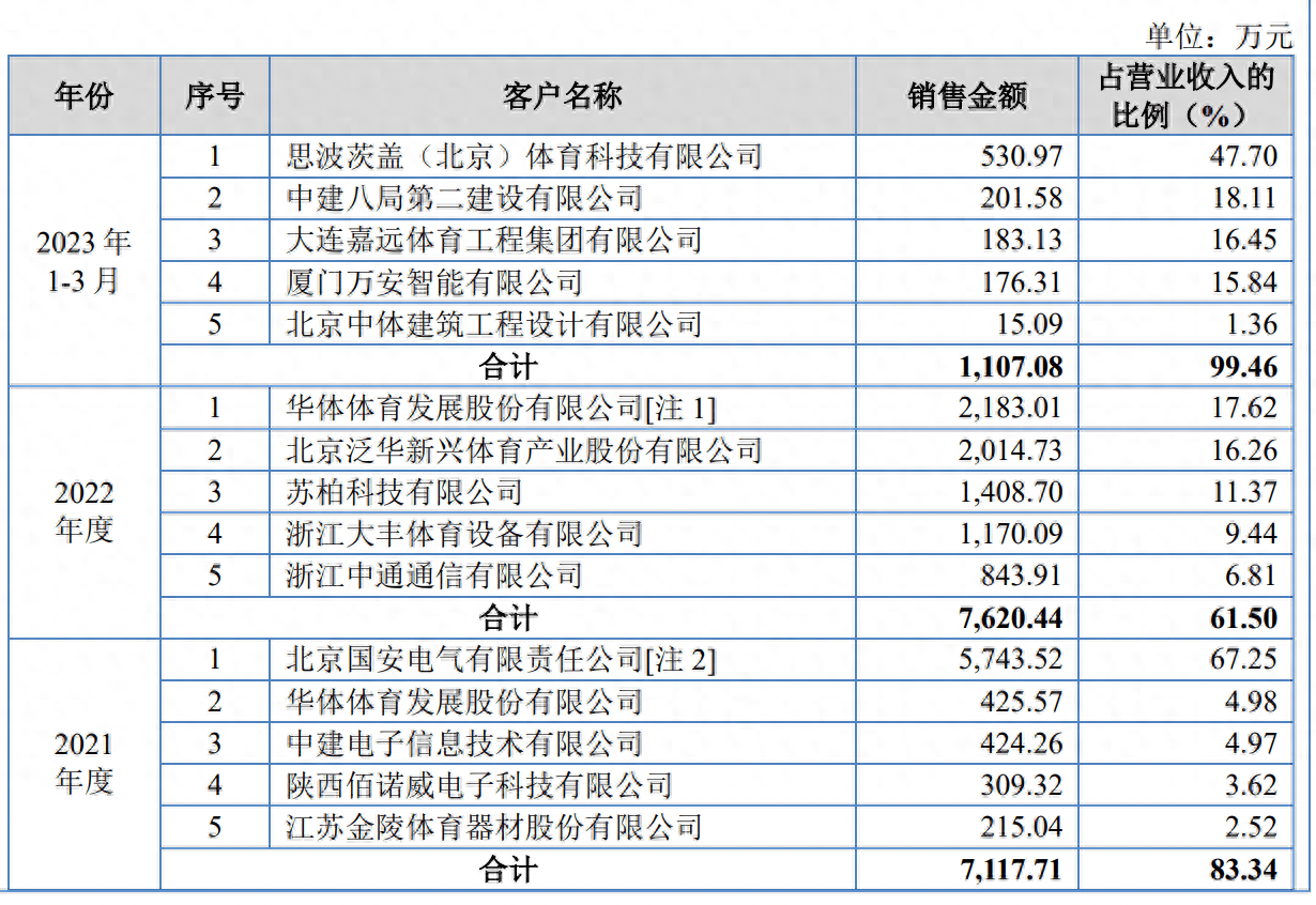 2023年1-3月该公司前五大客户为,思波茨盖(北京)体育科技有限公司、中建八局第二建设有限公司、大连嘉远体育工程集团有限公司、厦门万安智能有限公司、北京中体建筑工程设计有限公司。