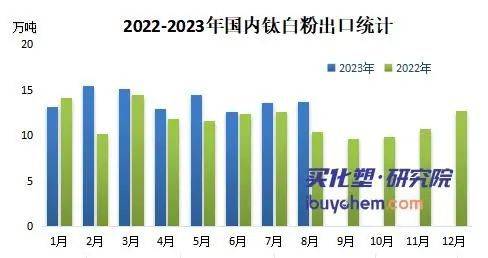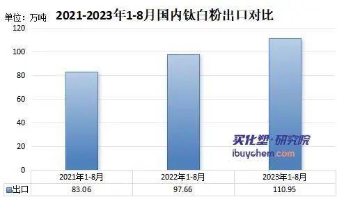 钛白粉作为地产行业息息相关的行业,其行业发展与竣工面积增速相关性更大,2023年1-7月份,房地产竣工面积累积增速20.5%,钛白粉需求有所复苏,但值得注意的是,在新增产能扩产的背景下,价格持续低迷,为消化过剩产能,国内钛白粉企业加大出口力度。