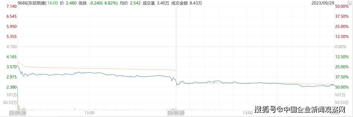 上市首日即破发,第二天再次下跌——9月28日,号称“互联网护理第一股”的东软熙康(HK09686,股价2.48港元,市值20.88亿港元)正式在港交所主板挂牌上市。东软熙康发行价为4.76港元/股,上市当天以2.72港元/股收盘,当日股价跌幅42.86%;9月29日,东软熙康再次震荡走低,最终收于2.48港元/股,下跌8.82%。