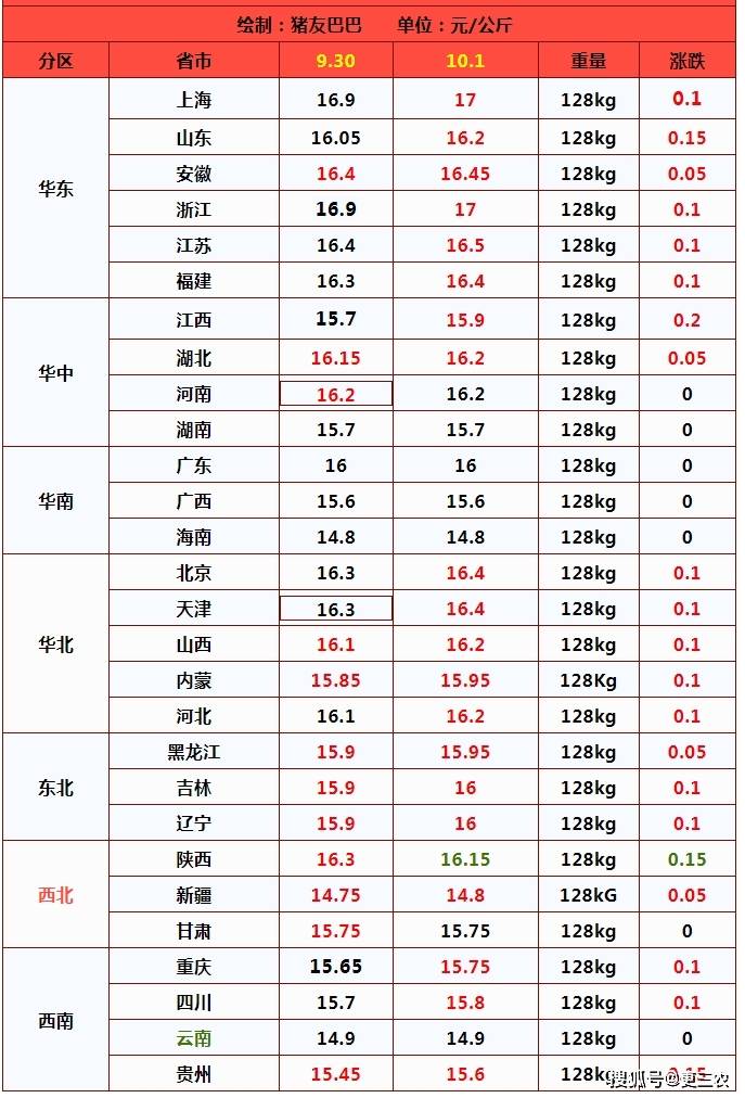 从市场反馈来看,10月1日,全国生猪报价均价与江西地区水平一致,其中,在东北以及华北地区,黑吉辽报价普遍涨至16元/公斤,华北市场,报价在15.95~16.4元/公斤!北方市场,猪价重心逐步涨破16元/公斤,而在南方市场,川渝报价涨至15.8元,山东、安徽、江苏报价16.2~16.5元,浙江报价涨至17元,湖南报价企稳15.7元,河南报价16.2元/公斤,两广地区,屠企报价横盘15.6~16元/公斤!