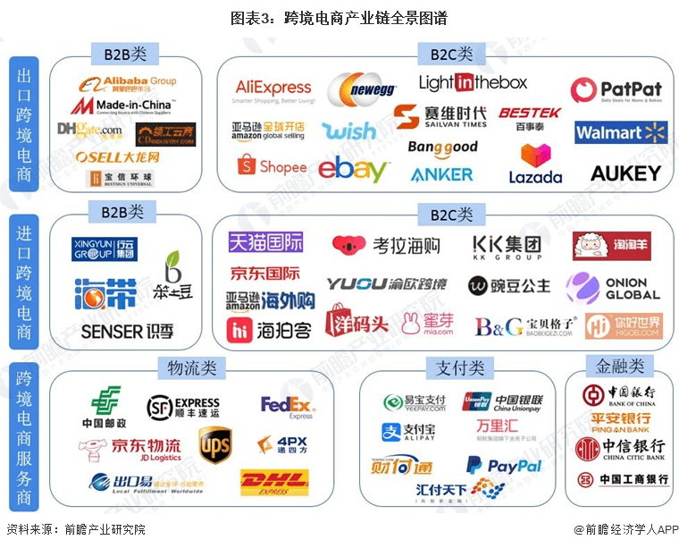 目前,我国跨境电商行业产业链企业丰富。出口跨境电商代表企业有阿里速卖通、赛维时代、百事泰、沃尔玛等;进口跨境电商有天猫国际、京东国际、考拉海购、洋码头等。
