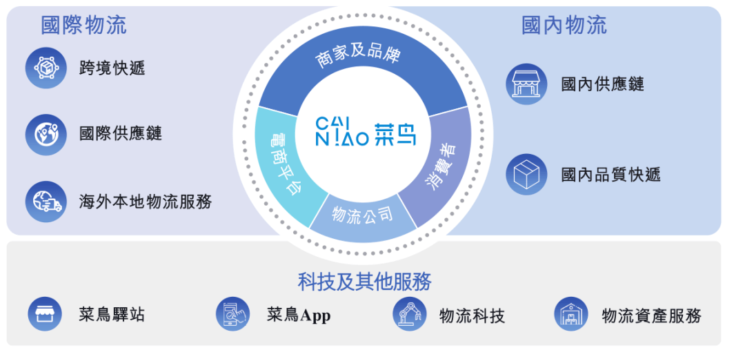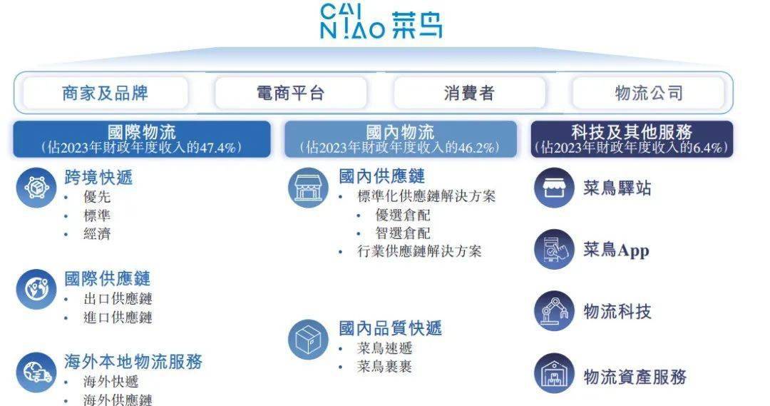 公司第三大业务,为科技及其他服务,包括菜鸟驿站、菜鸟App、物流科技、物流资产服务等业务。