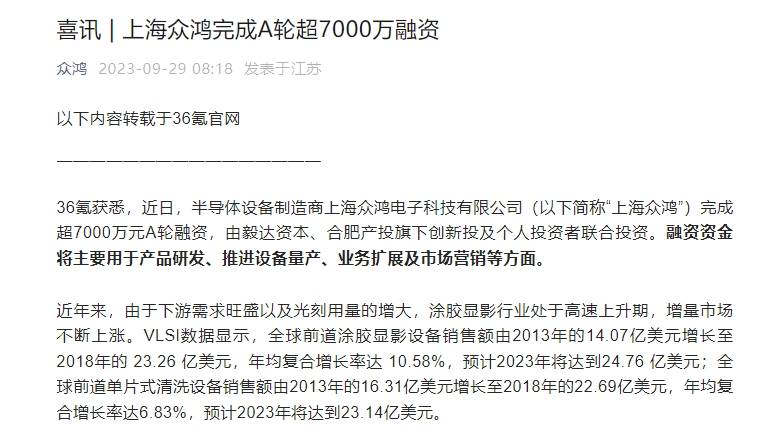 每经AI快讯,据众鸿公众号,近日,半导体设备制造商上海众鸿电子科技有限公司(以下简称“上海众鸿”)完成超7000万元A轮融资,由毅达资本、合肥产投旗下创新投及个人投资者联合投资。融资资金将主要用于产品研发、推进设备量产、业务扩展及市场营销等方面。