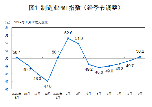 金融界10月1日消息 2023年9月30日,国家统计局服务业调查中心和中国物流与采购联合会发布了中国采购经理指数。9月份,制造业采购经理指数(PMI)为50.2%,环比上升0.5个百分点。总体来看,制造业PMI连续4个月环比上升,并且9月来到荣枯线上方,重新回到扩张区间。