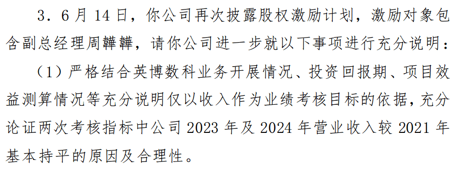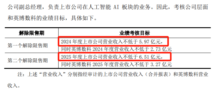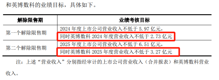 激励计划对激励对象的公司层面绩效考核,要求英博数科第一、第二个解除限售期,分别为2024年、2025年营收不低于2.73亿元、3.27亿元。