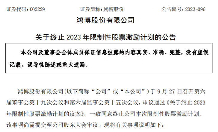 9月28日,鸿博股份公告称,公司董事会审议通过议案,终止限制性股票激励计划,最终尚需提交股东大会审议。