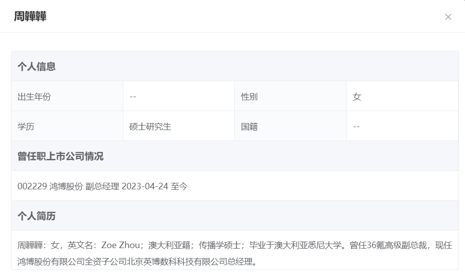 鸿博股份披露信息显示,周韡韡在入职鸿博股份之前,长期在传媒领域工作。