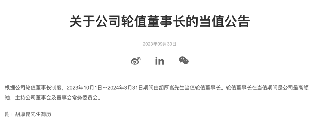 华为官网宣布,根据华为轮值董事长制度,在2023年10月1日-2024年3月31日期间,将由胡厚崑当值轮值董事长。