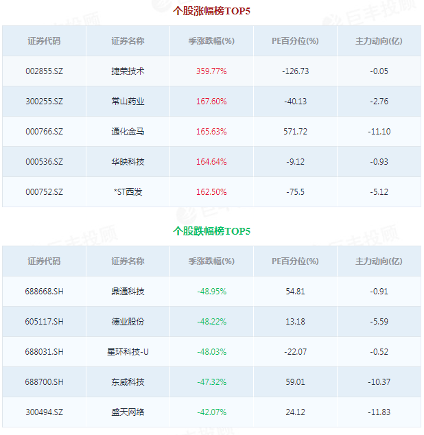 跌幅榜上,鼎通科技本季度暴跌-48.95%,此外,德业股份、星环科技-U、东威科技、盛天网络等本季度跌幅均超过-42%。