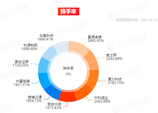 换手率方面,本季度以来,不计算上市新股,累计共有2365股季度内换手率合计超100%,其中,1127只个股区间换手率在200%以上。此外,换手率在50%至100%之间的有1492只,换手率在10%至50%的有1108只。具体个股来看,星源卓镁达到2495.95%,资金进出极为活跃,成为本季度的“换手王”。此外,威士顿换手率为2243.48%位居第二,通力科技换手率为2183.15%位居第三。