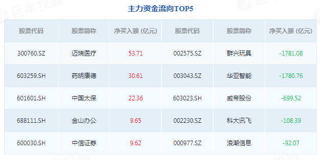 主力资金流向方面,本季度主力资金净流出1.28万亿,连续4季度净流出。板块方面,净流出最多的板块为机械设备,累计流出资金8.61万亿。个股方面,最青睐迈瑞医疗,净买入该股53.71亿元,连续2天净流入,药明康德被净买入30.61亿元,一季度出现38天净流入,群兴玩具、华亚智能则被净卖出居前,两股本周净卖出金额分别为1781.08亿元、1780.76亿元,连续3天净流出。