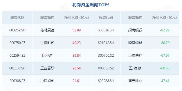 北向资金累计净卖出约801.31亿元。药明康德成“香饽饽”,爆买52.89亿元,值得注意的是,北向资金半个月对该股加仓已近7.07亿元;宁德时代加仓额位列第二,金额为49.23亿元;净卖出方面,招商银行、隆基绿能等遭抛售。