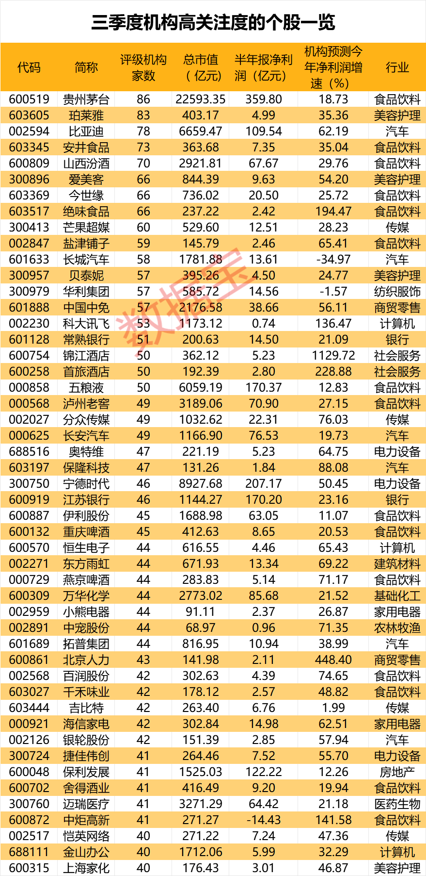 三季度以来,49股获多家机构集中评级,贵州茅台、珀莱雅、比亚迪位列前三,评级机构逾75家。