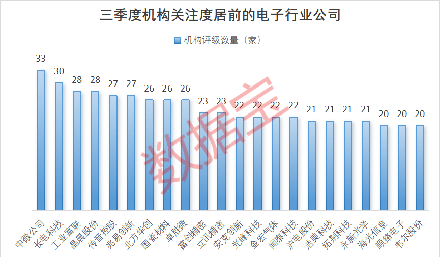 分行业看,电子、医药生物最受机构关注,获评公司270家及以上;机械设备、电力设备、计算机、基础化工等紧随其后,上榜公司均在150家以上。电子板块中,半导体芯片赛道较为瞩目,中微公司、长电科技和工业富联热度居前,分别有33家、30家和28家机构参与公司评级,另外兆易创新、北方华创、卓胜微、拓荆科技、沪电股份等均属于半导体芯片行业。