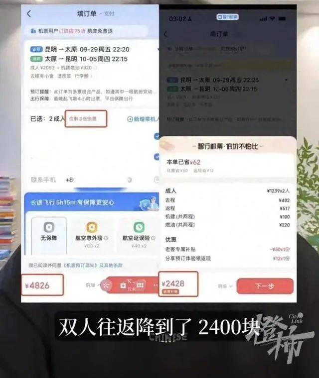 一位网友吐槽自己提前20天,预订了9月29日从昆明飞太原的机票,双人往返价格为4800多元。可最近一看,发现价格降到了2400多元,他的心情就像是坐上了一趟“5折的过山车”。