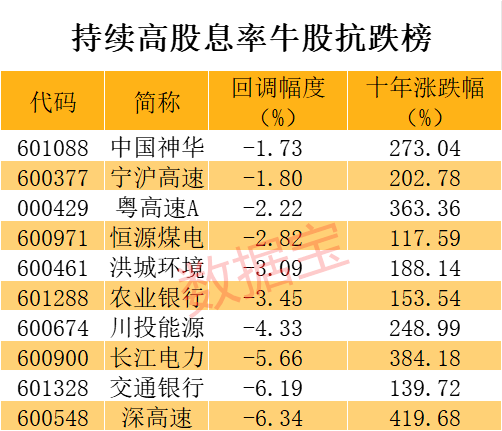 一批抗跌的超级慢牛股也浮出水面。上述翻倍股中,有中国神华、宁沪高速、粤高速A等13只个股最新价较十年来高点回撤不足10%。其中,宁沪高速、粤高速A等个股近期更是创出历史新高。