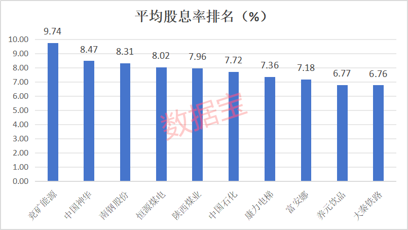 排名第二位的是超级大白马中国神华,最新总市值接近6500亿元,近五年股息率分别为9.23%、11.28%、10.05%、6.90%和4.9%,平均股息率为 8.47%。另外,南钢股份、恒源煤电、陕西煤业、中国石化、康力电梯、富安娜等个股平均股息率均超7%。
