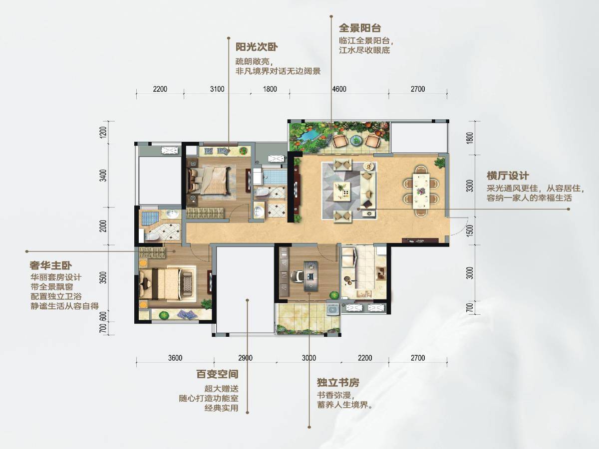 恭城徐福桃花源主推建面约108~144㎡,房源特点为横厅设计,采光通风俱佳;临江全景阳台,江水尽收眼底;超大赠送百变空间,随心打造功能室;奢华主卧带全景飘窗,独立卫生间;阳光次卧,疏朗敞亮。