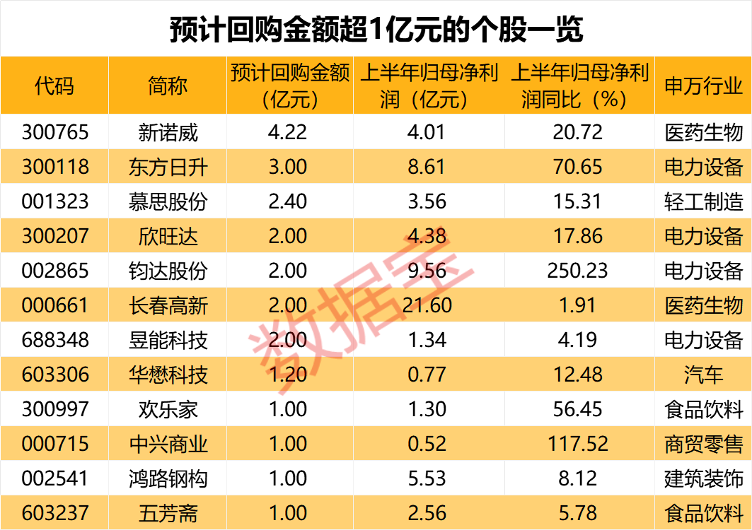 数据宝统计,上述27只回购金额上限超1亿元的个股中,有12股今年上半年业绩同比呈现增长,钧达股份、中兴商业上半年归母净利润额均同比翻倍增长。