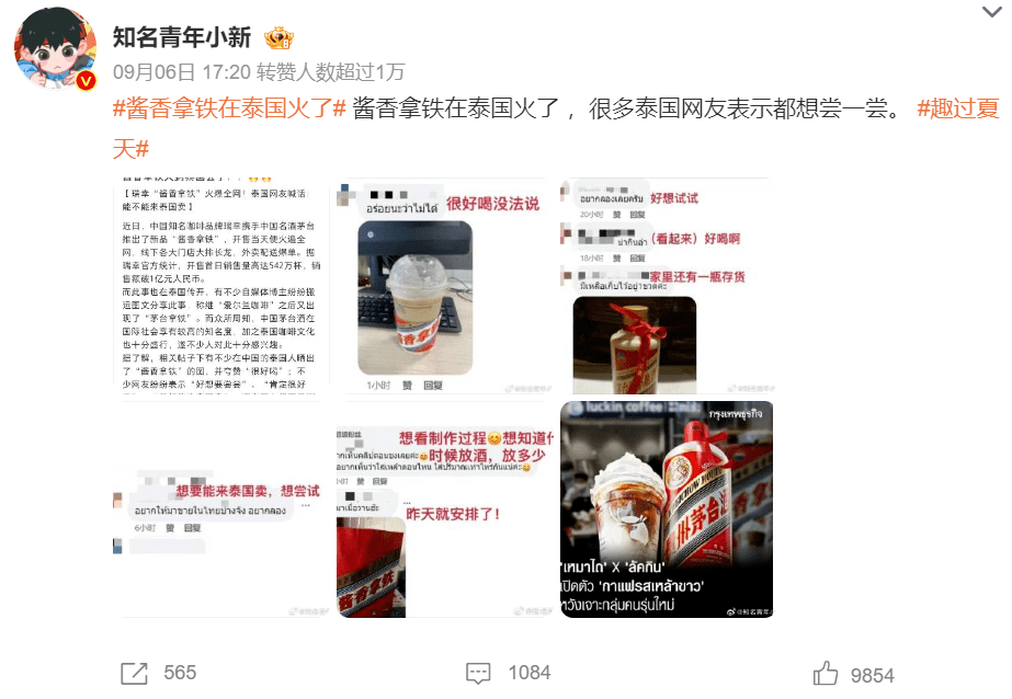 酱香拿铁在泰国火了、酱香拿铁已经火到韩国等热搜话题已有4.7亿阅读量,许多外国网友表示“想喝喝到底是什么味道”。
