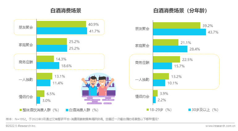 年轻消费者是白酒消费的潜力群体,“18-29岁”消费者在商务应酬和一人独酌场景中选择白酒的占比高于30岁以上群体/图源:艾瑞智研