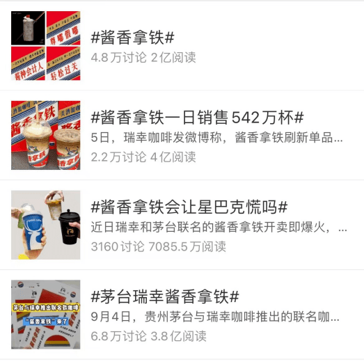 “酱香拿铁一日销售542万杯”的阅读次数达到4亿,“茅台瑞幸酱香拿铁“则有3.8亿次阅读。