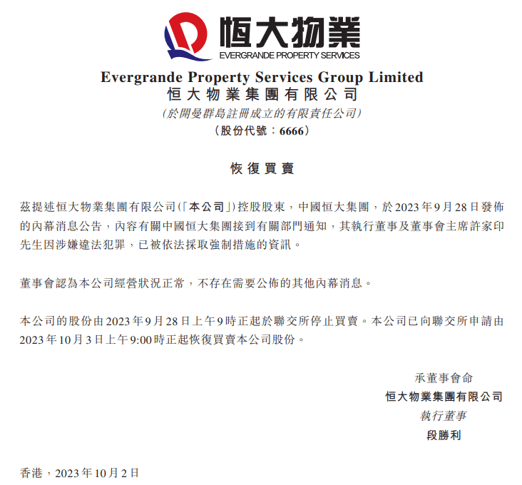 原标题:中国恒大、恒大物业:已向联交所申请于2023年10月3日上午9:00起恢复买卖