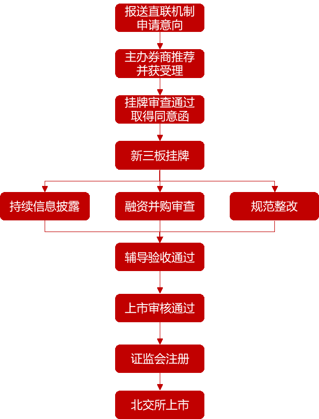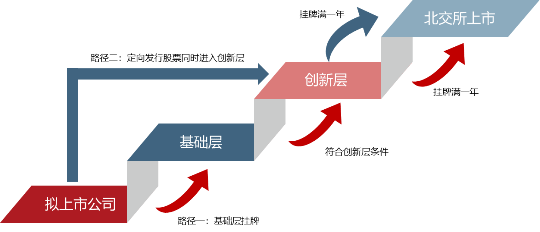 即满足条件的非挂牌企业先在基础层挂牌,再由新三板基础层转为创新层,挂牌一年后可申请北交所IPO上市。