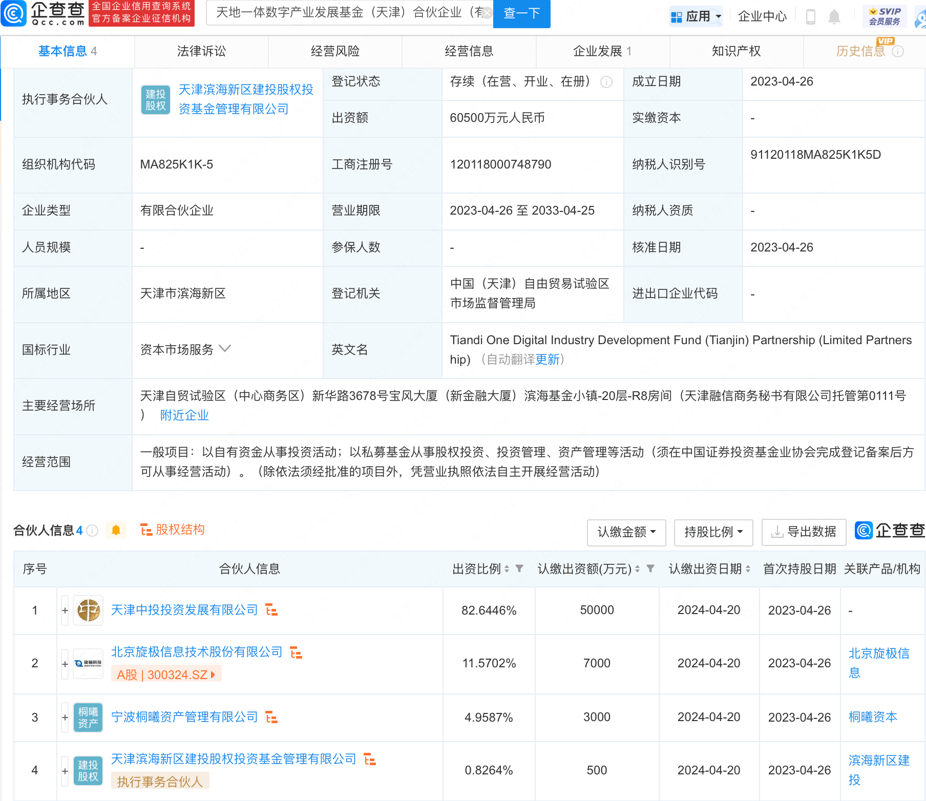 企查查APP显示,天地一体数字产业发展基金(天津)合伙企业(有限合伙)成立,执行事务合伙人为天津滨海新区建投股权投资基金管理有限公司,注册资本6亿余元,经营范围包含:以自有资金从事投资活动;以私募基金从事股权投资、投资管理、资产管理等活动。企查查股权穿透显示,该公司由旋极信息(300324)等共同持股。
