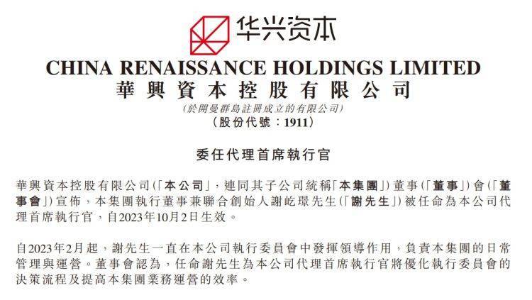 今日晚间,华兴资本控股(01911)在港交所公告,集团执行董事兼联合创始人谢屹璟被任命为公司代理首席执行官,自2023年10月2日生效。