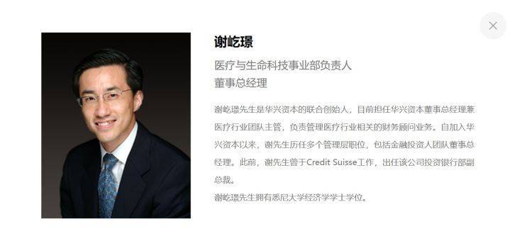 据介绍,谢屹璟,53岁,华兴资本控股创始人、执行董事、董事总经理、投资银行事业部联席负责人及医疗与生命科技事业部负责人。谢屹璟目前亦担任公司环境、社会及管治委员会主席、执行委员会成员及公司若干子公司的董事。