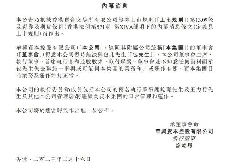 今年2月16日,华兴资本公告称,公司暂时无法与董事会主席、执行董事、首席执行官、控股股东包凡取得联系。董事会并不知悉任何资料显示包先生失去联络一事与或可能与本集团的业务或运作有关。