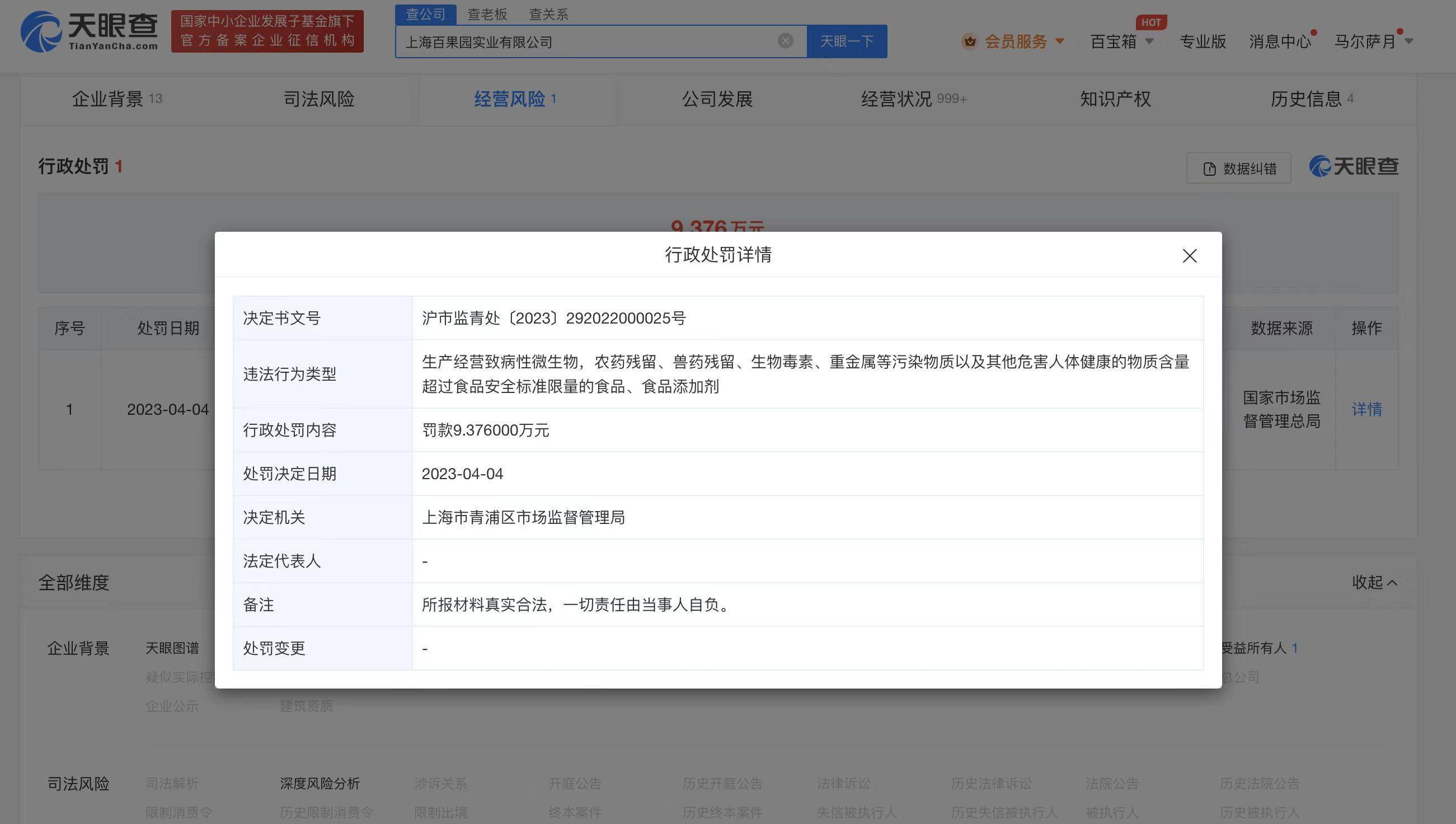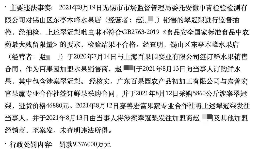 值得一提的是,近期,百果园全资子公司上海百果园实业有限公司因水果含农药超标,被上海市青浦区市场监督管理局罚款9.3万余元。处罚事由显示,当事人一加盟水果店销售的翠冠梨吡虫啉不符合要求,检验结果不合格,该翠冠梨系订购自当事人。