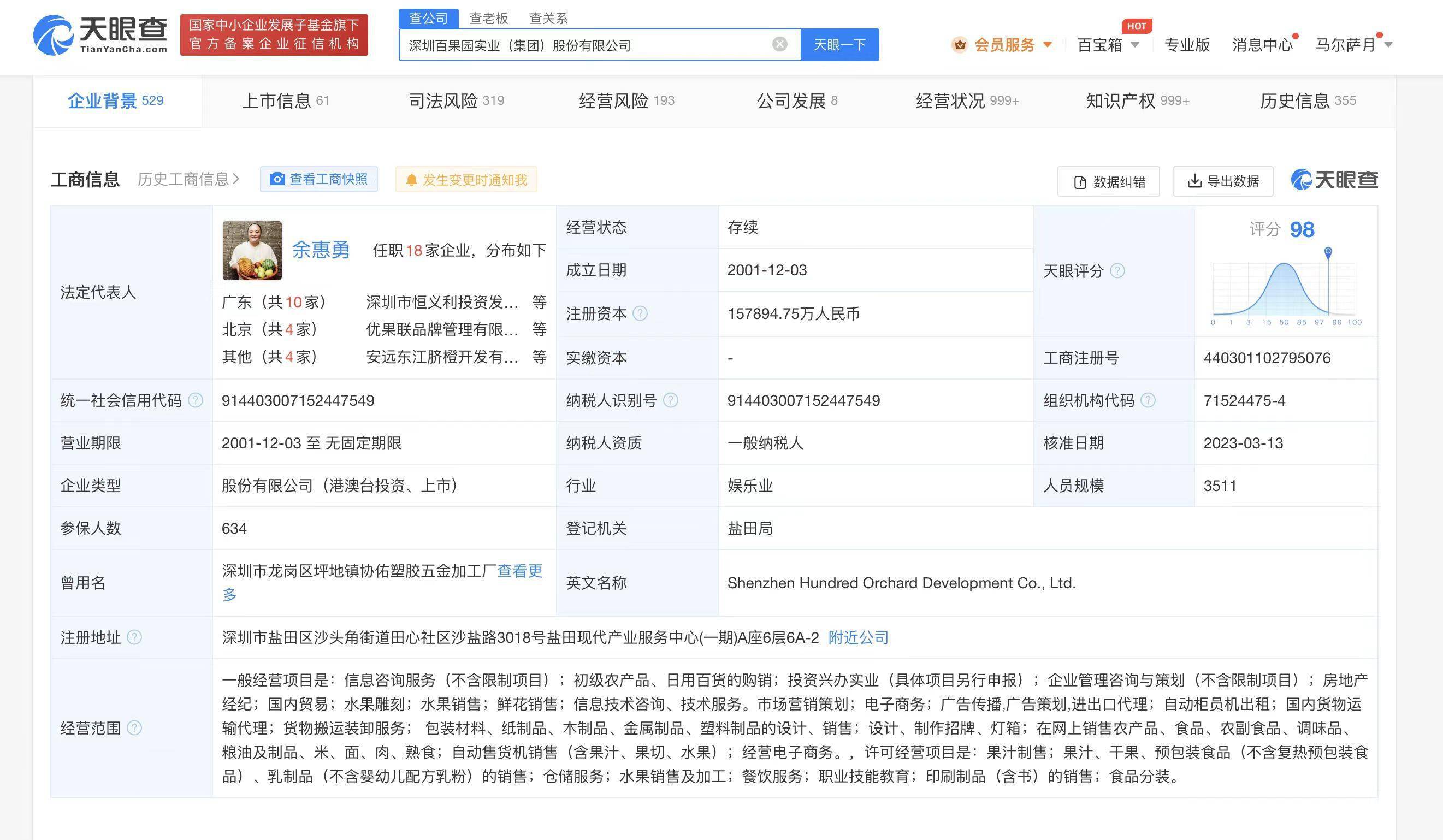 天眼查App显示,百果园关联公司深圳百果园实业(集团)股份有限公司成立于2001年12月,注册资本约15亿人民币,法定代表人为余惠勇,于2023年1月在港股上市。经营范围包括初级农产品、水果雕刻,水果销售,鲜花销售,仓储服务,餐饮服务等。对外投资信息显示,该公司直接持股企业20余家,涉及北京、广东、上海等省份。