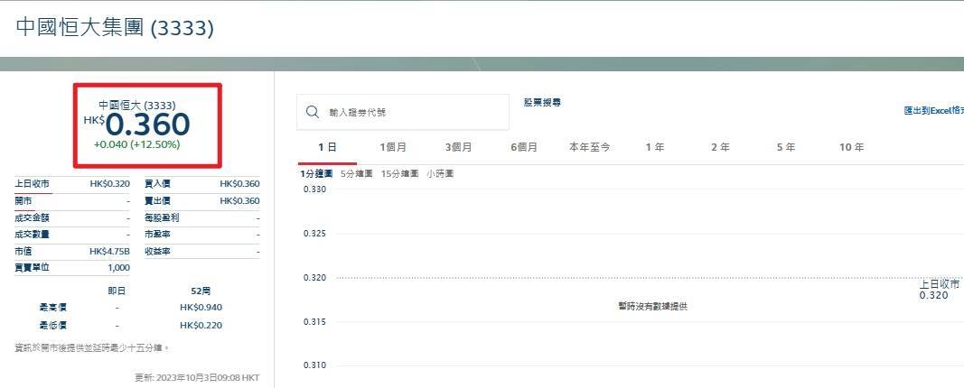 最新消息,中国恒大股票已从开盘前的每股0.32港币大涨至0.36港币,升幅高达12.5%!