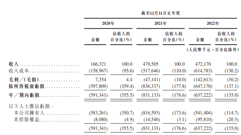 数据显示,2020年至2022年公司收入分别为1.66亿元、4.71亿元、4.72亿元。虽然公司收入逐步增长,公司亏损金额并没有减少,甚至还在扩大。