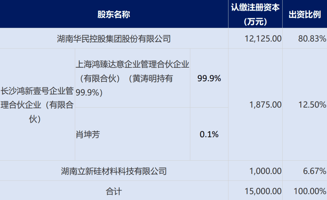 第一家公司鸿新新能源,最初是由建鸿达集团和立新硅材料(全称:湖南立新硅材料科技有限公司)共同出资成立。华民股份受让建鸿达集团股份80%股权。