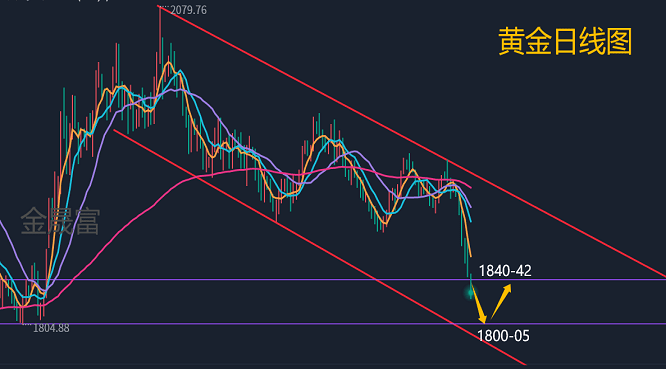 目前从4小时图结构来看,短线行情下跌至1830一线有争夺是有预期的,黄金均线继续死叉向下运行,空头趋势还是很明显。黄金全天一路下跌,没有任何反弹,这种走势说什么时候见底,还不好说,只能说顺势继续空起来,黄金稍微反弹至1840又回落,说明黄金1840还是有很大的阻力,整体技术面形态是很清晰的极弱压制空头,任何反抽均是做空机会,保持顺势参与主基调不变,综合来看,今日黄金短线操作思路上金晟富建议反弹做空为主,回调做多为辅,上方短期重点关注1840-1842一线阻力,下方短期重点关注1800-1805一线支撑,各位朋友一定要跟上节奏。要控制好仓位及止损问题、严格设止损,切勿抗单操作。近期市场动荡幅度较大,机会与风险并存,控制风险再博收益。