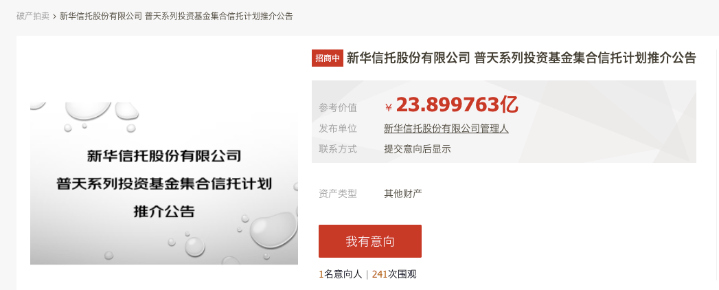 此后,新华信托旗下资产陆续被拍卖。首批13项新华信托持有的信托产品上架京东拍卖平台,截至目前已历经第四轮拍卖,但因无人出价,仍以流拍告终。
