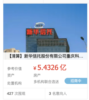 阿里拍卖平台显示,新华信托清算组拟对新华信托办公大楼及相应的土地使用权公开变价处置,拍卖参考价格为5.4326亿元以上。