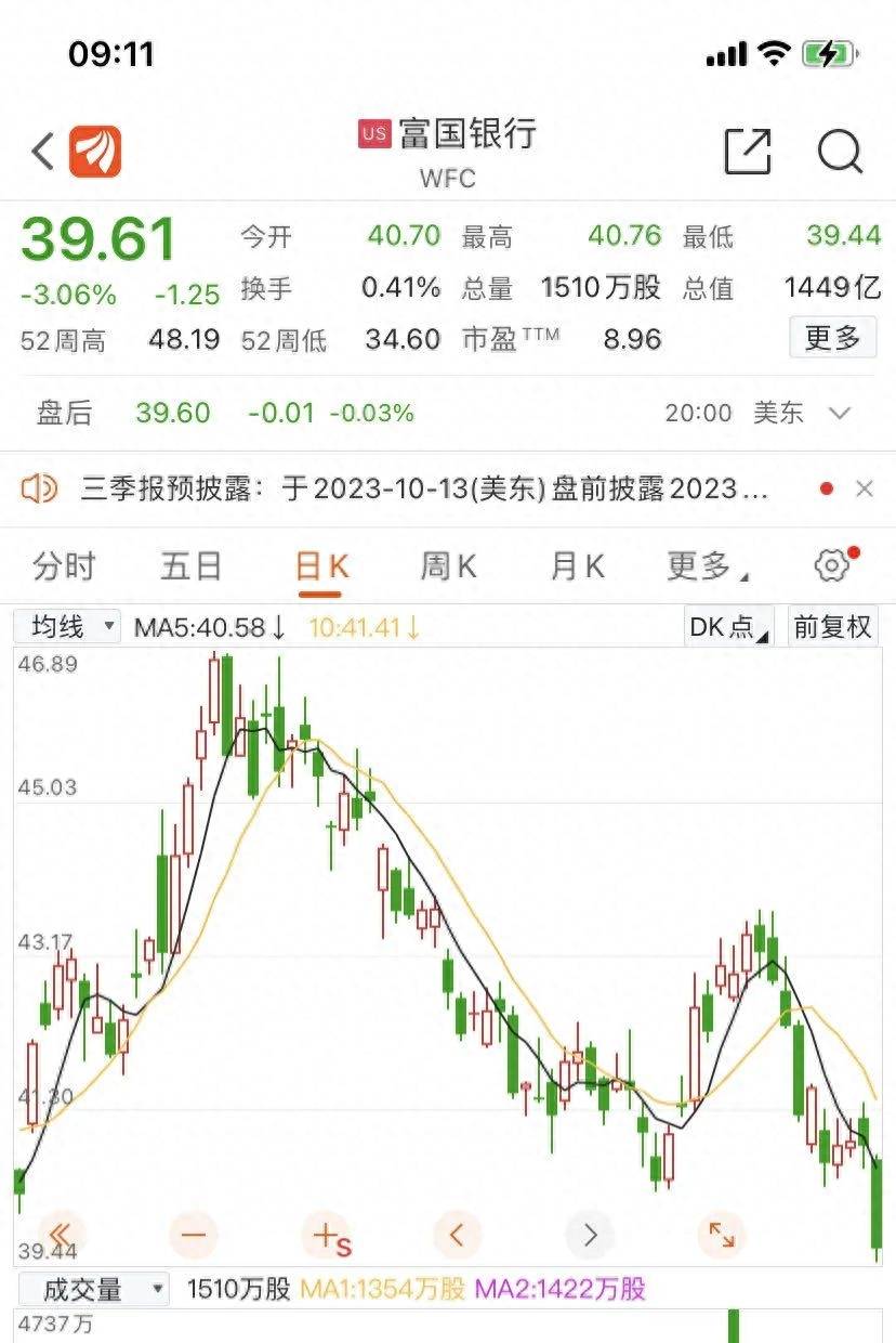 截至美股周一收盘,富国银行(WFC)报收39.61美元,收跌3.06%,总市值1449亿美元。