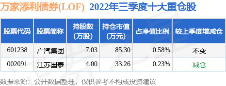 万家添利债券(LOF)为债券型-混合债基金,根据最新一期基金季报显示,该基金资产配置:无股票类资产,债券占净值比87.12%,现金占净值比0.9%。基金十大重仓股如下: