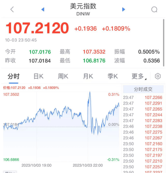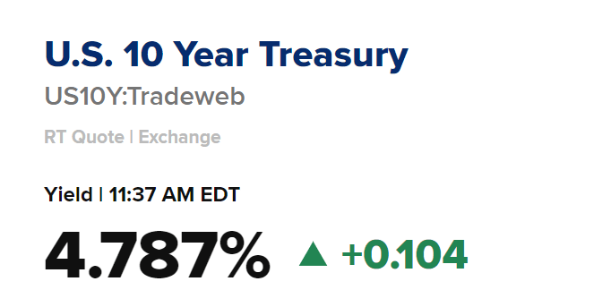 10年期国债收益率最新报4.787%,这是16年以来的新高。投资者最近一直对长期加息的可能性感到担忧,担心紧缩的货币政策可能导致经济陷入衰退。这已将国债收益率推至十多年来未见的水平。