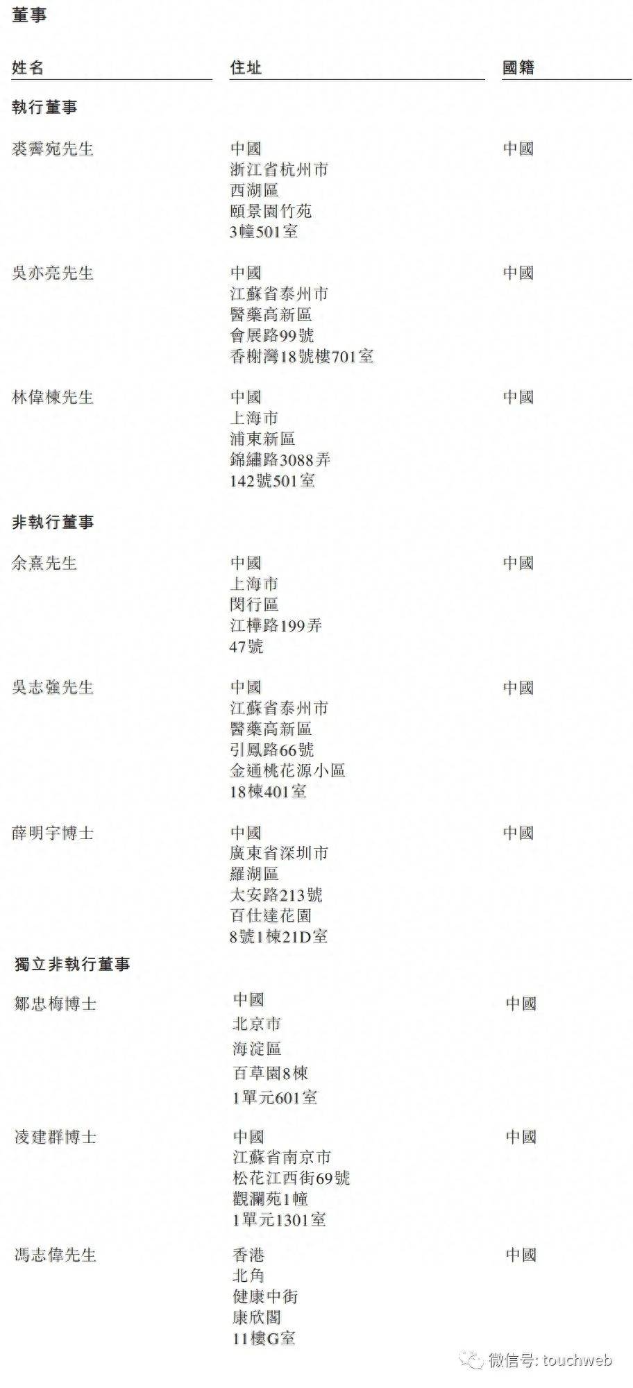 荃信生物执行董事分别为裘霁宛、吴亦亮、林伟栋;非执行董事分别为余熹、吴志强、薛明宇博士;独立非执行董事分别为邹忠梅博士、凌建群博士、冯志伟。