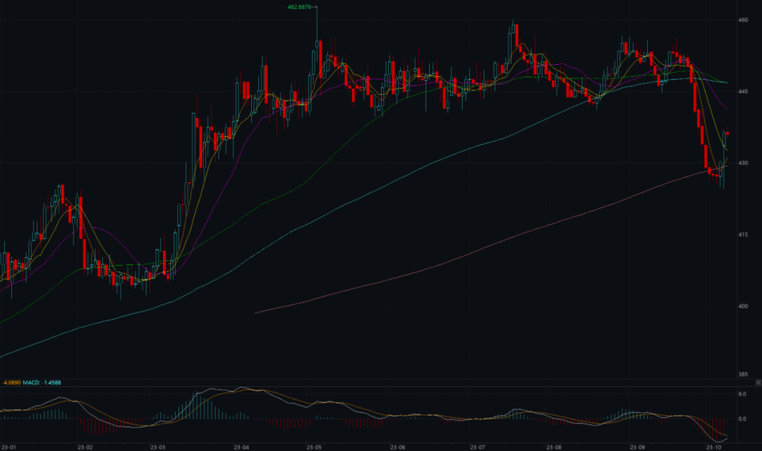 10月6日,伦敦金一度继续下探,但最终以约430元每克收盘,当日上涨0.70%,结束了连续下跌势头。10月9日开盘,受国际形势影响,投资者避险需求增加,当日伦敦金约上涨0.69%,以436.29元每克收盘,但仍未达到9月25日的相对高位。