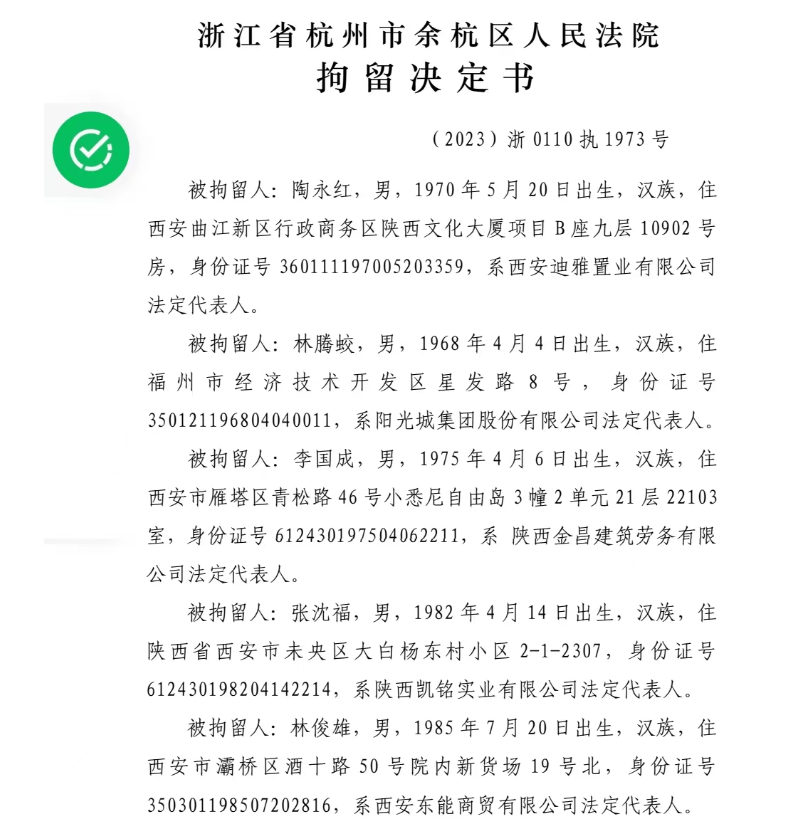 10月10日,一封关于《浙江省杭州市余杭区人民法院拘留决定书》在业内流传。其中,提及被拘留人涉及阳光城集团股份有限公司法定代表人林腾蛟,落款时间为2023年9月7日。