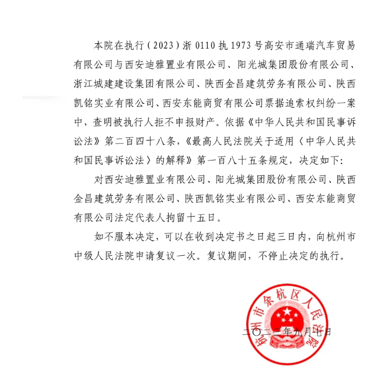 对于拘留原因,浙江省杭州市余杭区人民法院称,我院在执行(2023)浙 0110 执1973 号高安市通瑞汽车贸易有限公司与西安迪雅置业有限公司、阳光城集团股份有限公司浙江城建建设集团有限公司、陕西金昌建筑劳务有限公司、陕西凯铭实业有限公司、西安东能商贸有限公司票据追索权纠纷一案中,查明被执行人拒不申报财产。