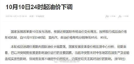 国家发展改革委10日发布消息,根据近期国际市场油价变化情况,按照现行成品油价格形成机制,自10月10日24时起,国内汽、柴油价格每吨分别降低85元、80元。 本轮成品油调价周期内国际油价大幅震荡。