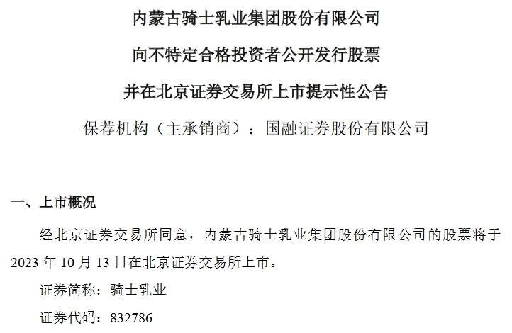 挖贝网 10月11日消息,骑士乳业(832786)将于10月13日在北交所上市,同日从新三板摘牌。据介绍,公司聚焦乳、糖产业,业务涵盖产业链上下游并形成农、牧、乳、糖四大板块,今年上半年实现营收4.95亿元,同比增长33.74%。